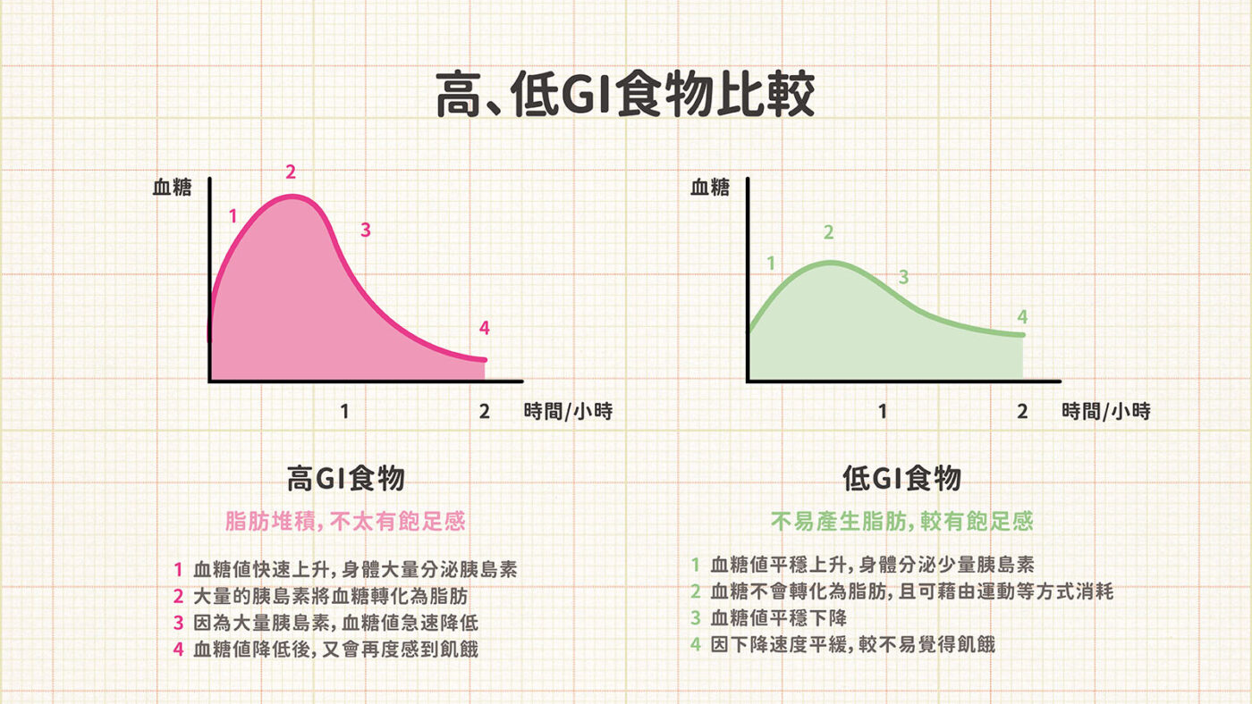 - 符合低GI概念的食物: 則能讓血糖緩慢且穩定地上升,有助於維持血糖平衡、延長飽足感,進而對體態管理和整體健康有所幫助。