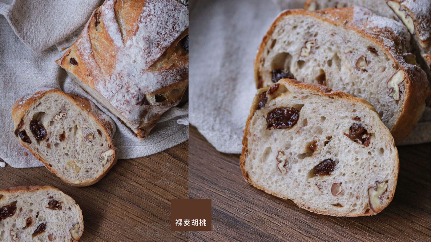 使用T130裸麥粉製作的裸麥胡桃麵包,裡面添加用裸麥培養的酸種酵母,所以吃起來有一些酸味。麵團裡添加了高抗氧化的「胡桃」,讓這款麵包多了酥脆口感和奶油香氣。