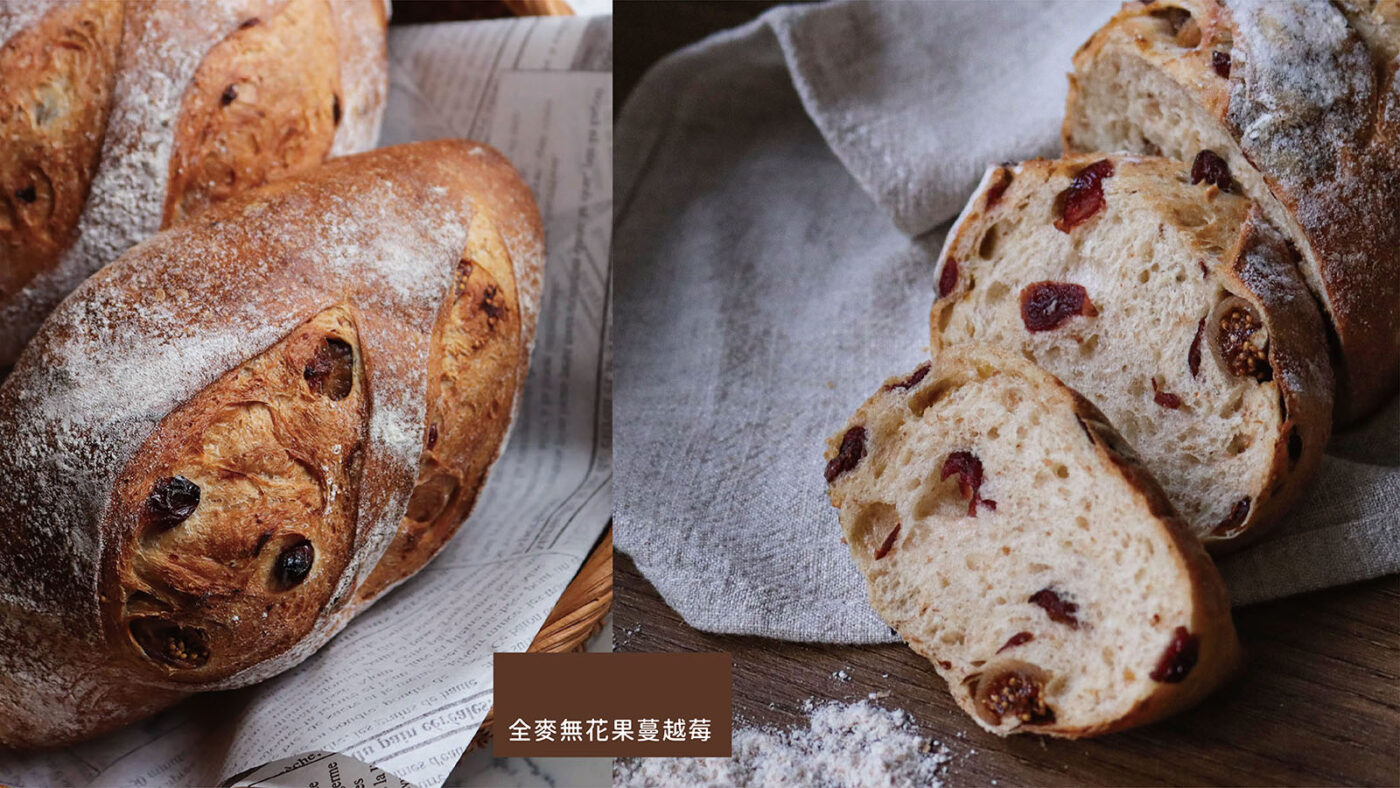 添加一定比例的全麥麵粉,並且拌入無花果乾、蔓越莓乾與魯邦種酵母,發酵烤培後的麵包皮薄脆內Q彈嚼勁,咬到果乾時與麵包體一起發散果物與麥的香氣,是相當平易近人且受歡迎的一款麵包。