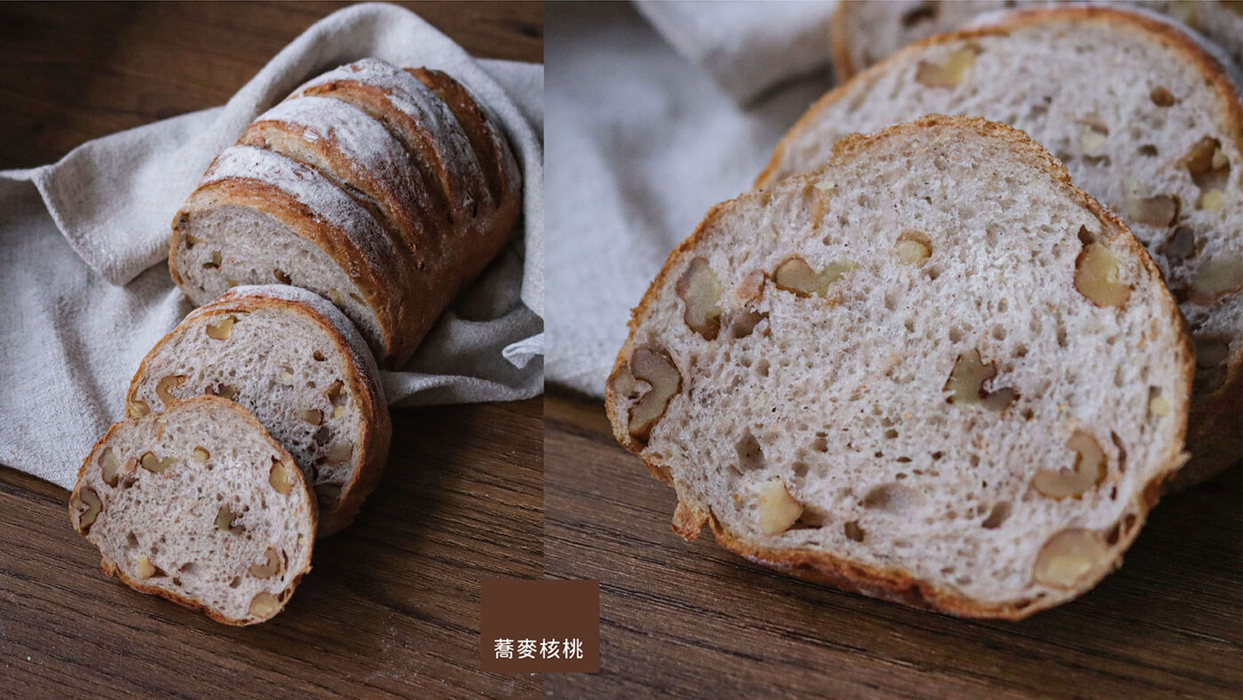 我們在製作此款產品時,添加蕎麥粉與魯邦種酵母,麵包切面可以看到細細一粒粒的蕎麥,並在麵團內添加法國奶油及「核桃」,增加了爽脆口感,嚼麵包時不時會散出香氣。